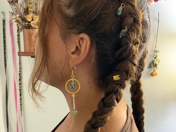 A type of jewelry worn on the ear, typically in a piercing, that comes in various styles. Traditionally they’re used to express personal style, cultural identity, or adorn an outfit.
